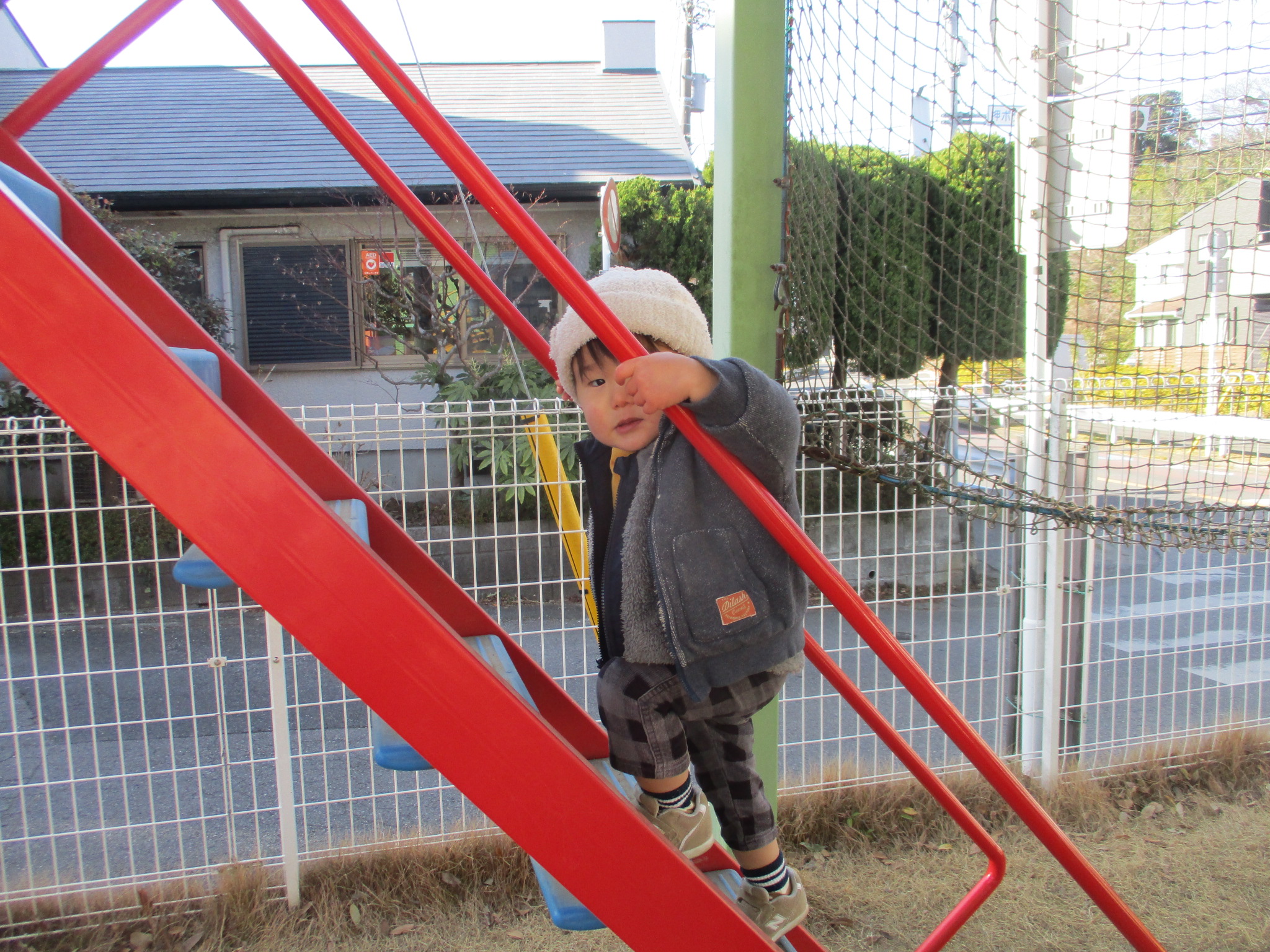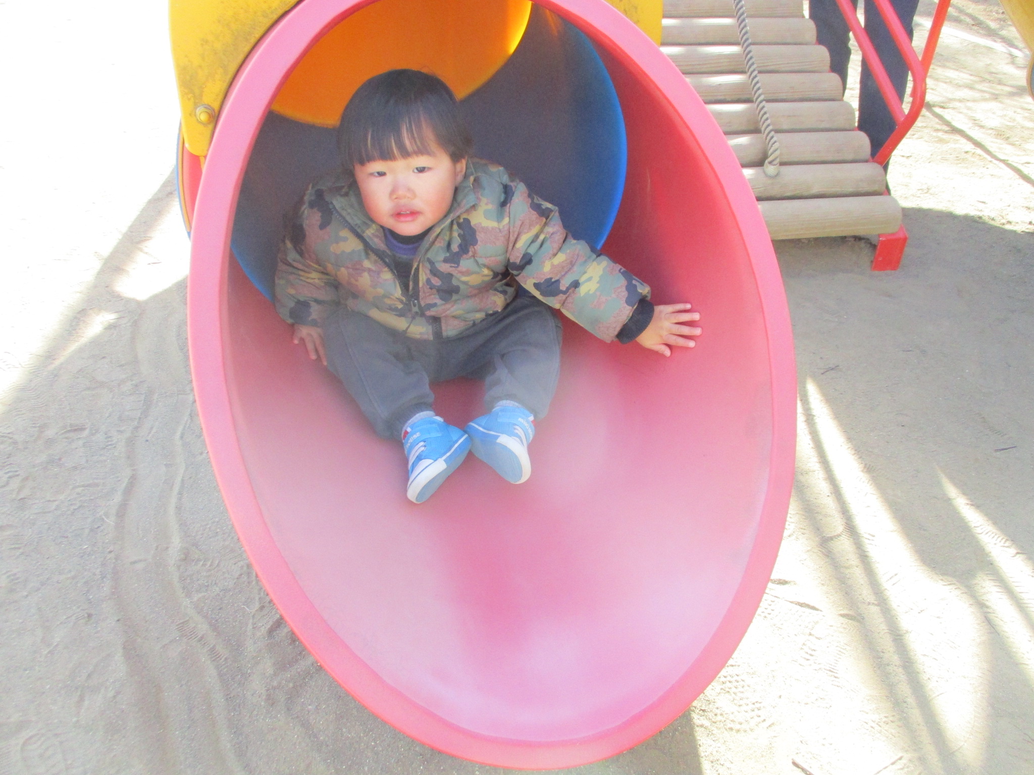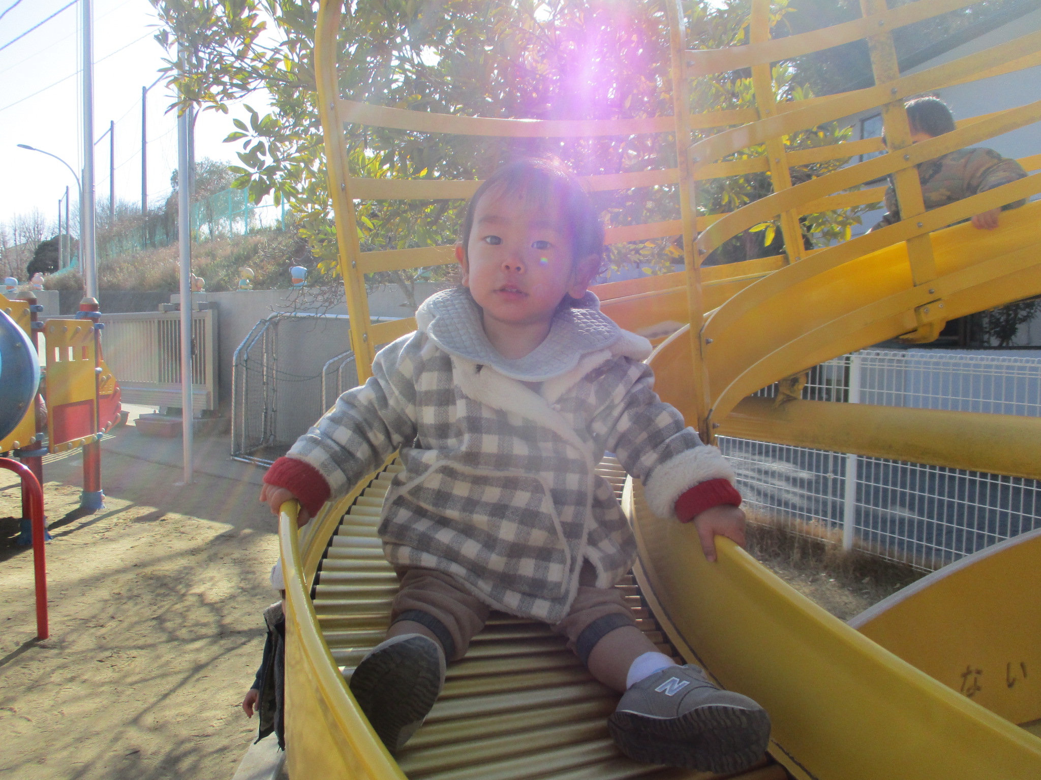 今回は4組の参加者に来て頂きました。園庭開放を行ない、ローラー滑り台やボール、三輪車を中心に体を動かして遊びました。しゃぼん玉コーナーでは、大きなしゃぼん玉を作って見せると、興味を示し、子ども達も次々に飛ばして楽しんでいました。後半は室内遊びを行ない、遊戯室で巧技台の滑り台を滑ったり、ジャンプクッションを駆け抜けるように渡っていました。ままごとキッチンコーナーでは、お鍋を置いてみたり、下の扉の中に食べ物を入れたりしました。子どもたち同士で「いい?」「どうぞ」とやり取りしている姿も見られました。