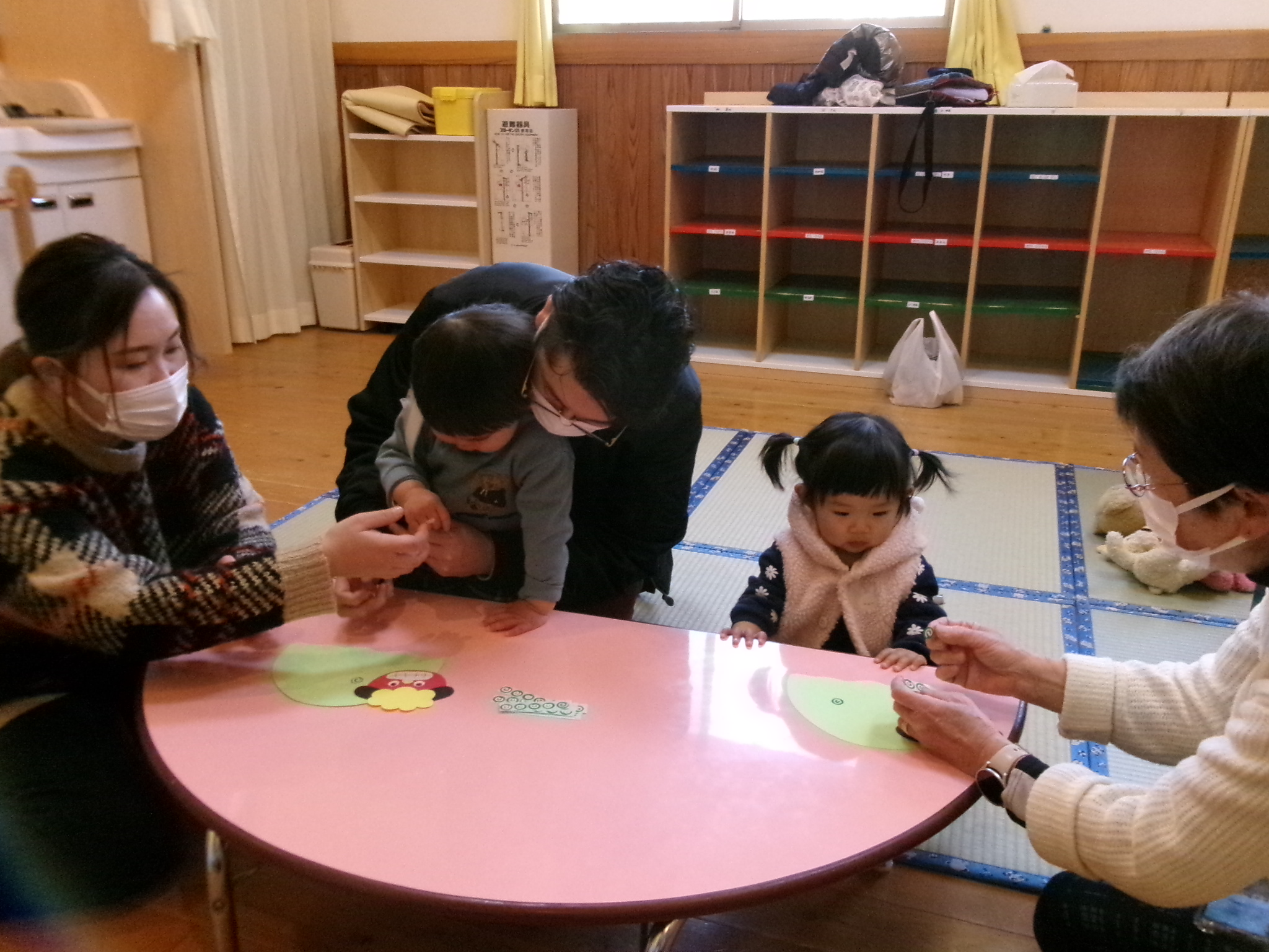 1月は2家庭にご参加いただきました。以前参加してくださったご家庭が来てくださり、お部屋のぬいぐるみやおもちゃにとても興味を持って、お子様同士で同じおもちゃで遊ぶ姿が見られました。また、お正月にちなんで、獅子舞の製作も行ないました。保護者の方とシールをペタペタと指先を使って楽しそうに貼ることができていました。