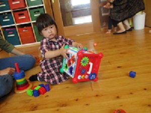 平成31年度第1回ポカポカクラブ報告 丸山旭保育園 今月は3家庭にご参加いただきました。初めての場所に少し緊張した様子でしたが、玩具に触れたりお友達に近寄ったりしながらゆったりとした時間を過ごしました。保育者が披露した傘袋シアターにも興味津々で、じっと見たりにっこり笑ったりしながら楽しい時間を過ごしました。